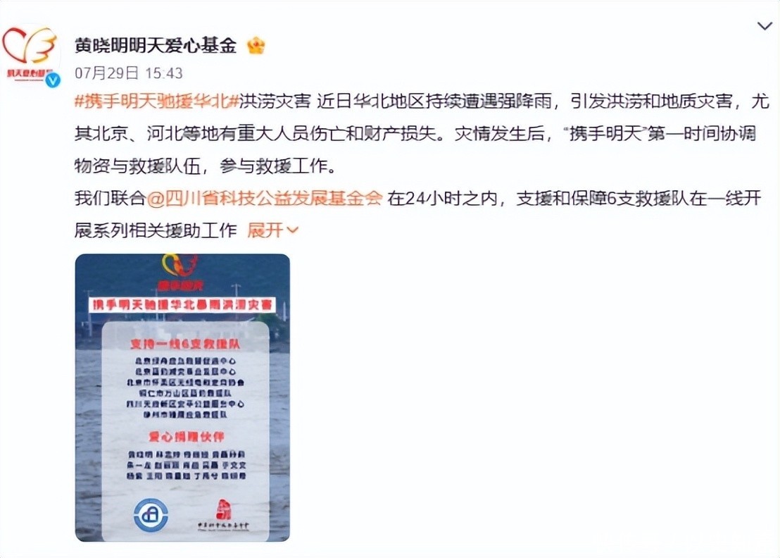 同年北京及周边遭遇极端强降雨灾害,黄晓明明天爱心基金会紧急启动“携手明天”救援行动,连夜调度运输四千份家庭应急救援包直达灾区。