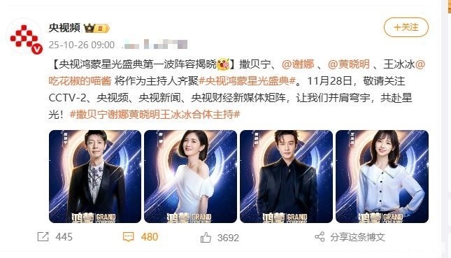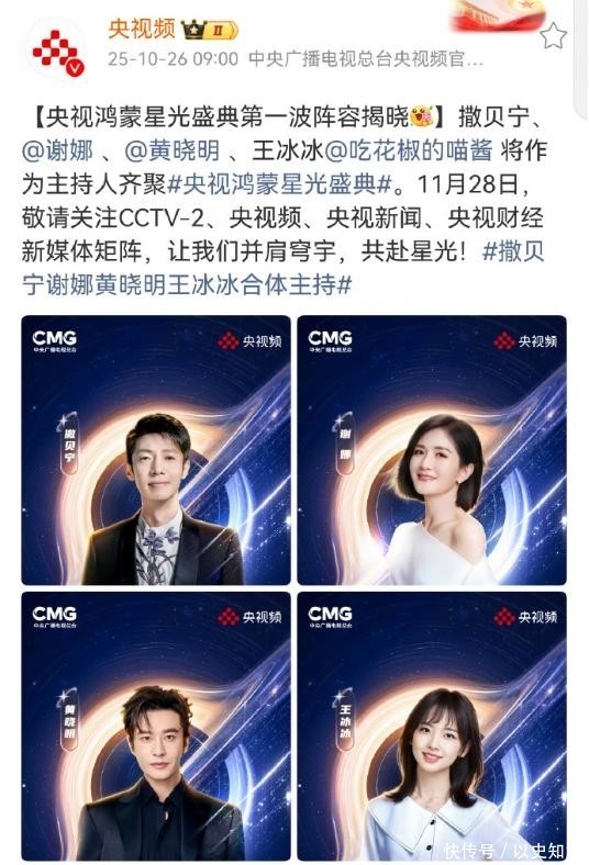 黄晓明将携手撒贝宁、谢娜、王冰冰共同执掌11月28日鸿蒙星光盛典的主持大权。